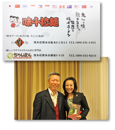 重光悅枝小姐的父亲「重光孝治」是台湾美浓人,我猜想应该姓刘,因为有她给我们的名片中,我发现一个明显的「刘」自标记。重光先生15岁离开台湾前往日本发展,原本经营饮食店,不幸经营倒闭,在妻子的支持与鼓励之下成立拉面店。1968年创业,由7坪大小的空间,8个座位,发展到今日在全球有500多家分店。